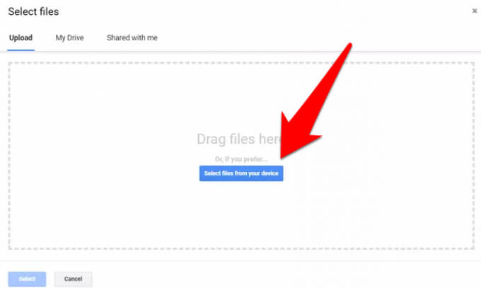 - Select add files from your **device** or via **Google Drive**, and click on the blue **Select** button to add the EPUB file.