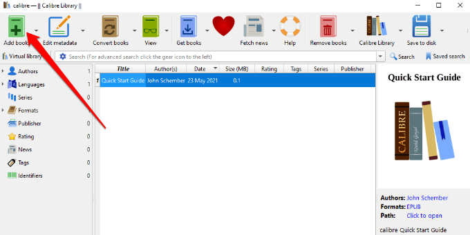 - Download and install Calibre on your computer, open the app, and select Add books.