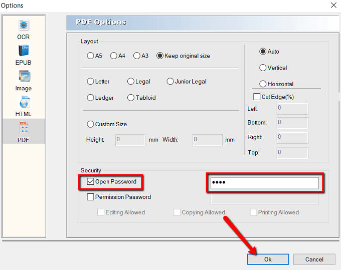 Under Security, check the box beside **Open Password **and on the same row, enter a password for your PDF. Once you’re done, click Ok.