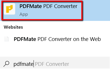 First, hit the Windows key and search for PDFMate PDF Converter. Then launch the program.