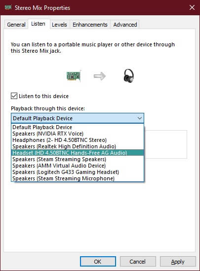 - Under the playback through this device dropdown, select your headphones