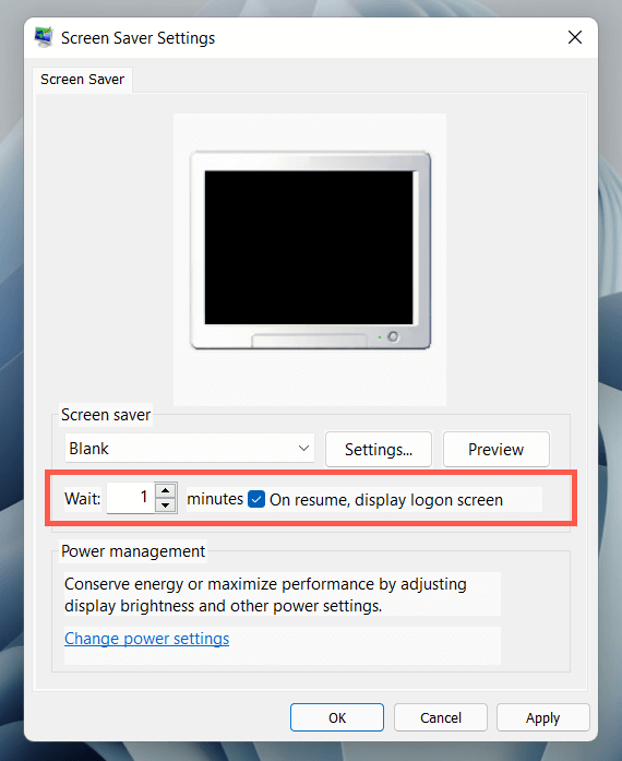 - Specify a time in minutes within the Wait box, check the box next to On resume, display logon screen, and select OK.