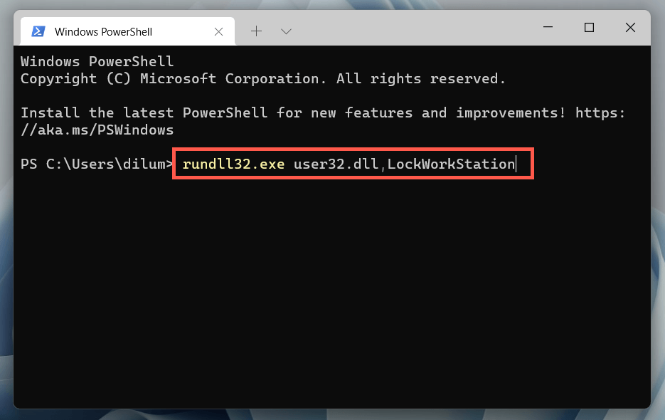 Another obscure way to lock a Windows 11/10 PC requires running a command through the Windows Terminal or Windows PowerShell consoles. Here’s how to use it: