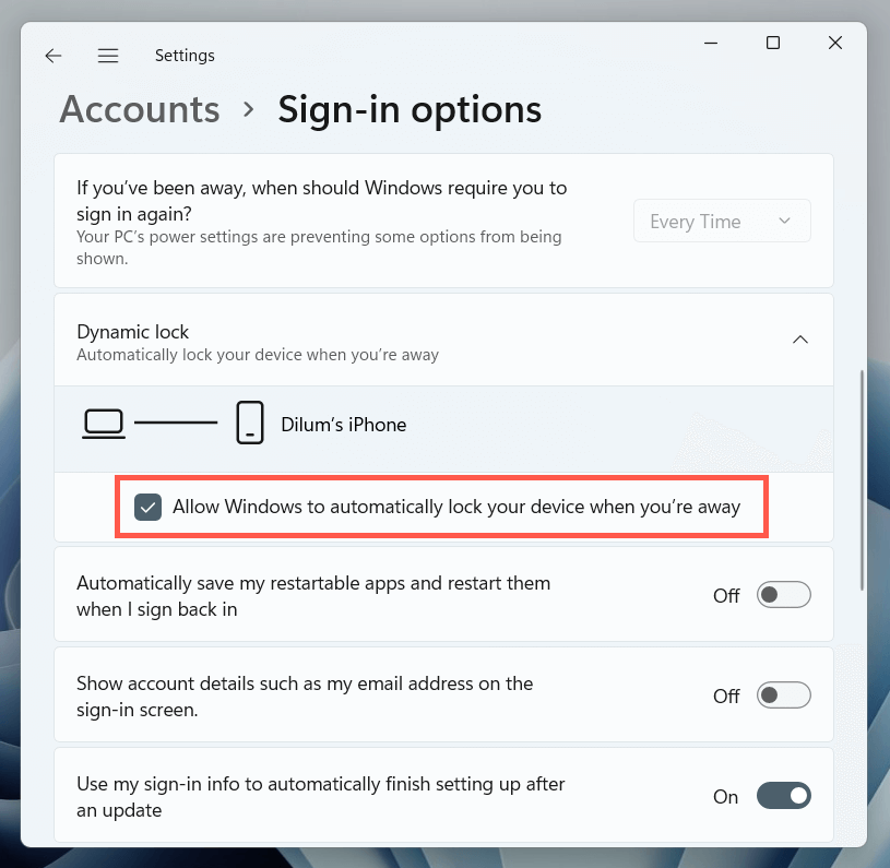 - Select Accounts > Sign-in Options and scroll down to the Dynamic Lock section.