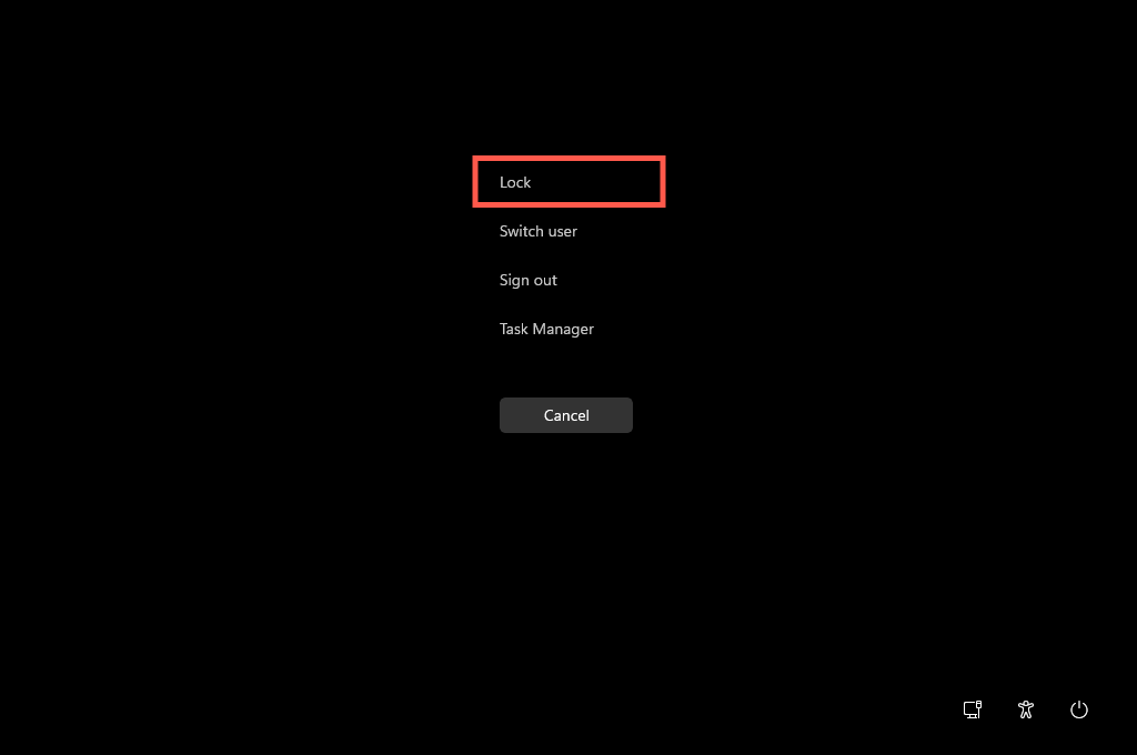 The Windows Security screen (a.k.a. the Ctrl + Alt + Delete screen) offers another quick way to lock Microsoft Windows. The best thing about this method is that you can use it even if Windows 11 or 10 isn’t responsive. Press Ctrl + Alt + Del to get the Windows Security screen to show up. Then, select Lock.
