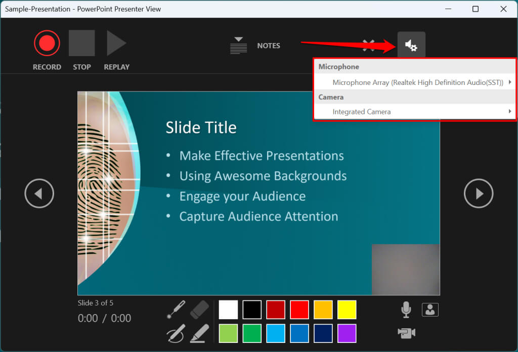 Want to record your presentation with an external microphone or camera? Press Ctrl + M or select the audio/camera settings icon in the top-right corner and choose your preferred microphone/camera.