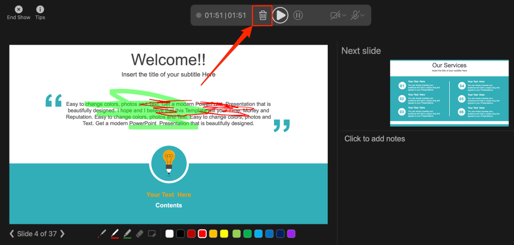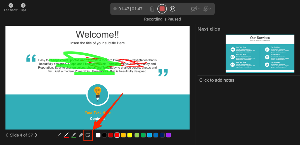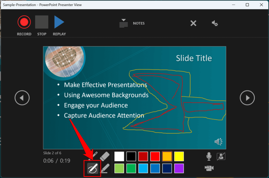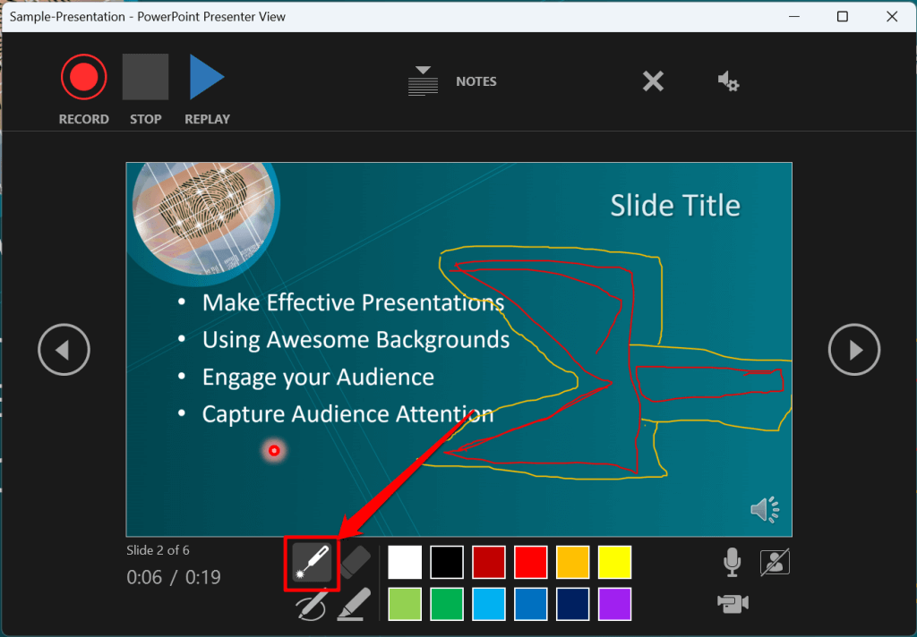 PowerPoint provides several tools to mark up your slides when narrating your presentation. There’s a pen tool, eraser, laser pointer, and highlighter.