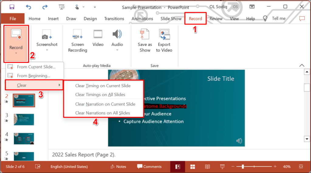 Want to delete the narration or timing on an individual slide or the entire presentation? Select the slide with the narration you want to delete and follow the steps below.