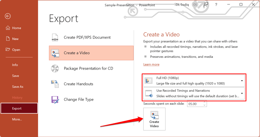 - Choose Use Recorded Timings and Narrations in the next drop-down box and select Create Video.