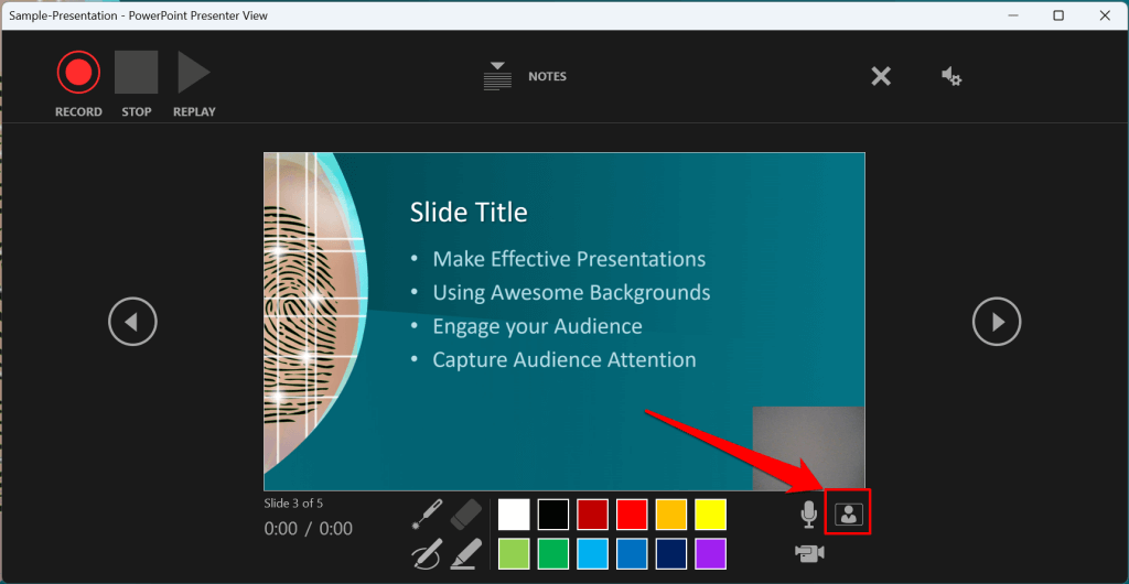 The recorder displays your camera or webcam feed in the bottom-right corner of the presentation slides.