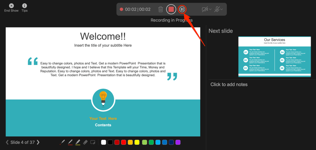 With the Pen tool, you can draw on slides during narration/recording. Press Ctrl + P (Windows) or Command + P (Mac) to use the pen tool. You can also select the Pen icon to convert the pointer to a pen.