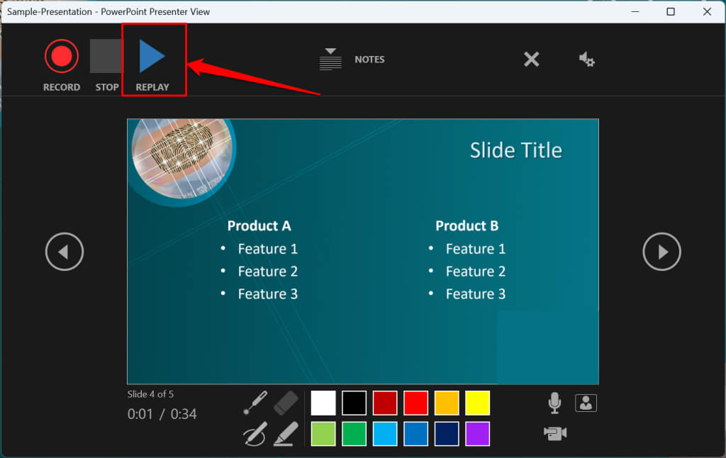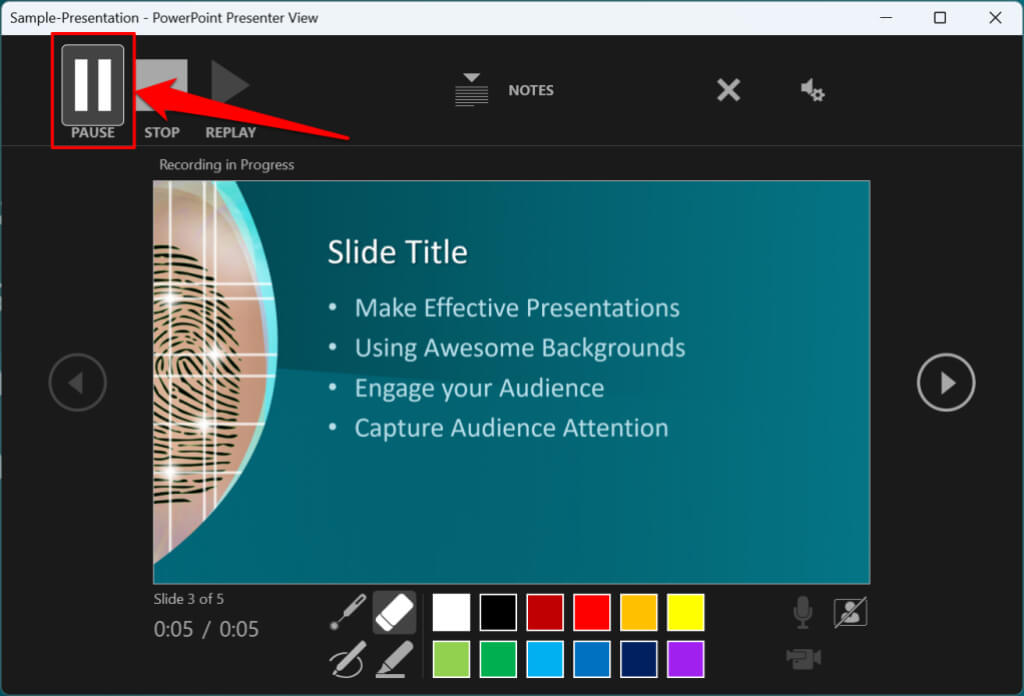 PowerPoint records the presentation window and captures your voice and webcam feed as you navigate the slides. Select the left-facing and right-facing arrows to move to the previous and next slides in the presentation.