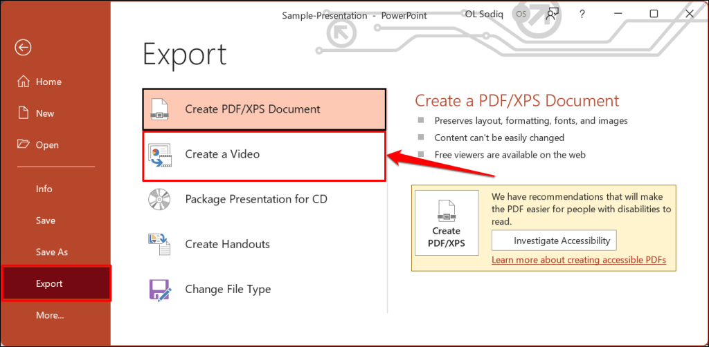 Alternatively, open the File menu, select Export on the sidebar, and select Create a Video.
