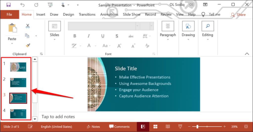 - * Select the slide you want to start recording from on the slide thumbnail pane.