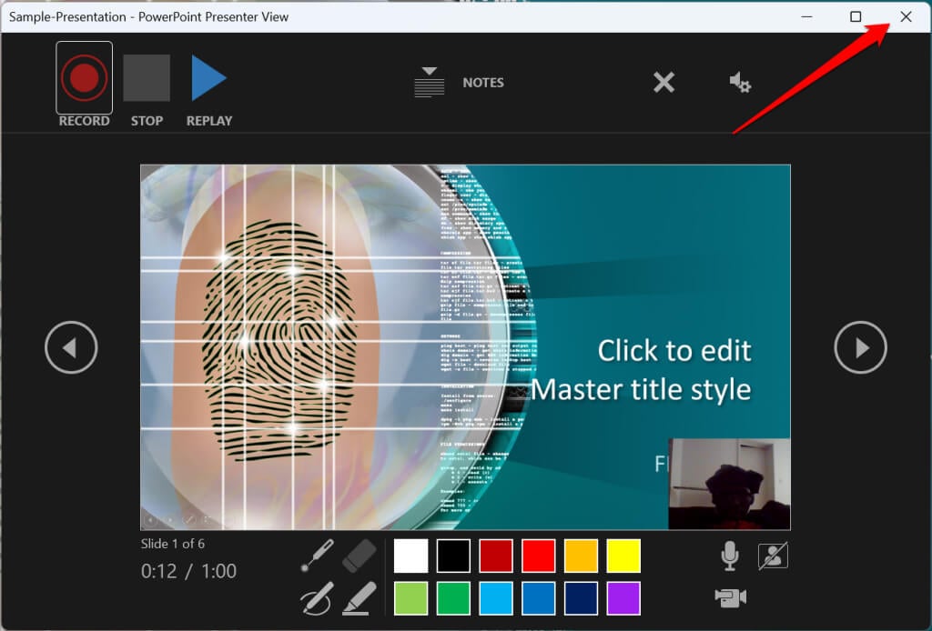 Select the X icon on the title bar to close the presentation narration tool and return to Powerpoint.