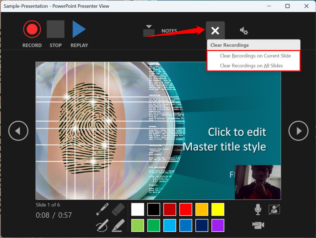 Select the Clear existing recordings icon and choose whether to Clear Recordings on Current Slide or Clear Recordings on All Slides.