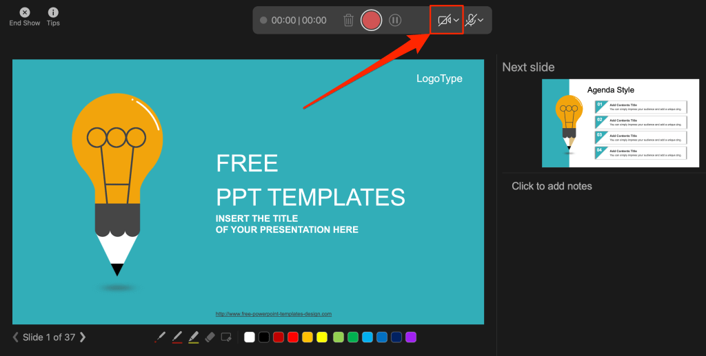 Select the camcorder icon to remove your webcam feed from the recording. Select the icon again to display your webcam feed in the presentation.