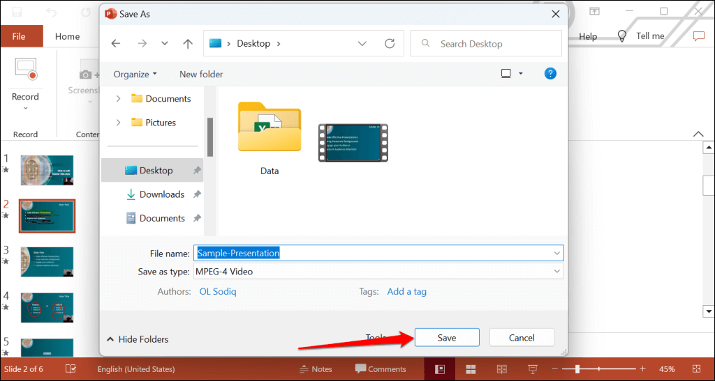 - Give the recorded presentation a file name and select Save.