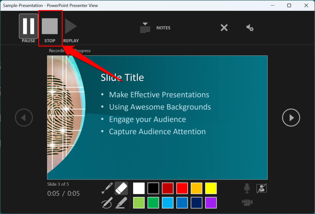 Press S on your Windows keyboard or select the Stop icon to end the recording.