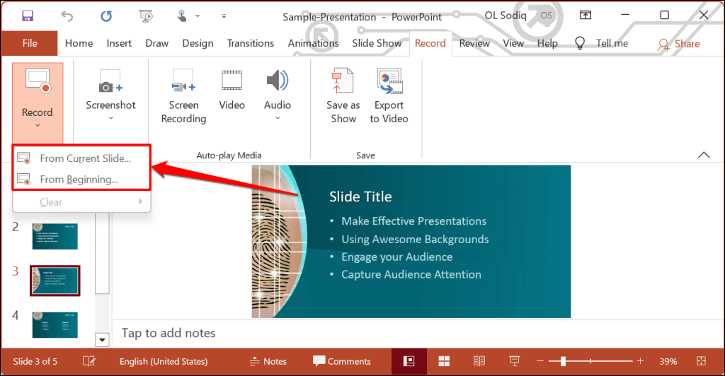 You can also record a presentation from the Slide Show tab. Select Slide Show on the ribbon and select Record, From Current Slide, or From Beginning.