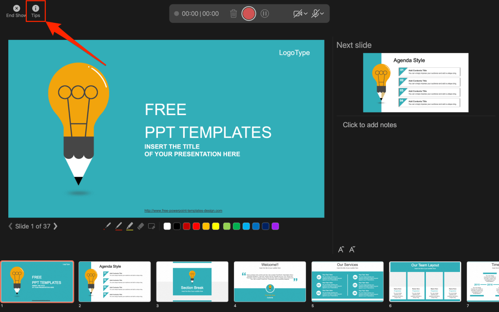 Select Tips in the top-left corner for more keyboard shortcuts and other presentation tips.