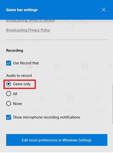 Next, scroll through the settings menu that pops up, and select **Game Only **under the Audio to record section. Alternatively, you can choose to record no sound whatsoever, or record all audio on your computer.