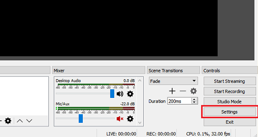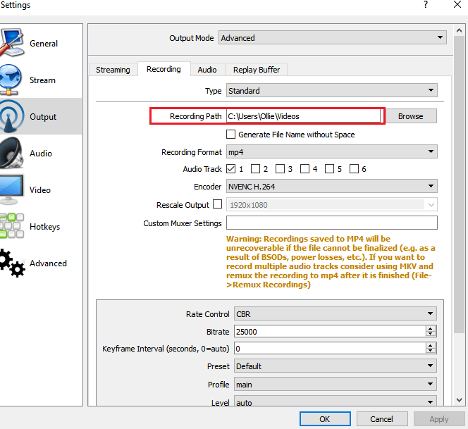 To see the exact output location, click the settings button on the OBS Broadcaster dashboard and click Output, then click** Recording**.