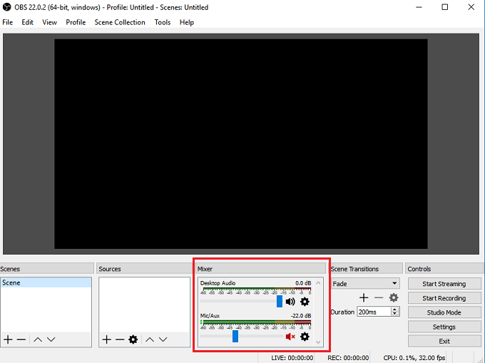 Once you have downloaded and installed OBS Broadcaster, you will see a screen that looks somewhat like what is shown below.