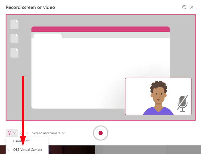 - In the **Record screen or video** popup, select the webcam icon and choose OBS virtual camera if you have a PC. Mac users should select **VirtualCam**.