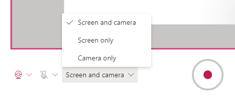 - If you only want to record your screen, choose **Screen only** in the **Screen and camera** dropdown. If you also want your webcam to record, choose **Screen and camera**. This option will allow you to create a screen recording with your webcam video appearing as an inset so you can narrate your screen recording as you go. If you only want to record using your webcam (i.e., you don’t want to record your screen), select **Camera only**.