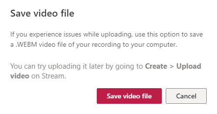 - If you want everyone in your company/organization to be able to view your video, check that box. Otherwise, you can set permissions by selecting **Update video details**. (You can always update the video details later. We’ll describe all the options below.) * From here, you can download the recording to your computer by selecting **Save video file**. This will save a .WEBM video file of your recording to the computer which you can always upload to Microsoft Stream later.