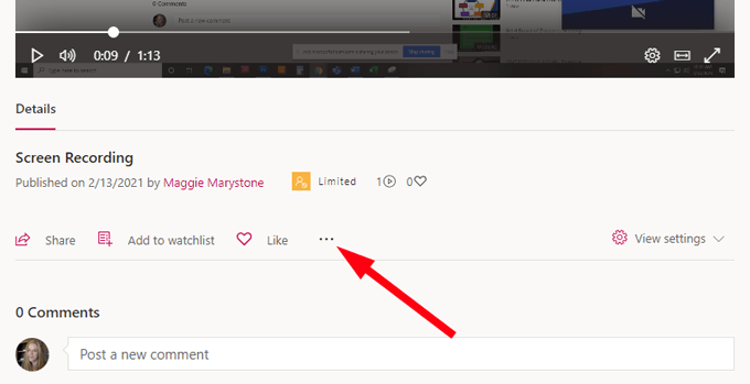 - That will take you to your recording’s page on Microsoft Stream, which is very similar to a video’s page on YouTube. All the options you would expect are here including **Share **(via direct link, email, or embed code), **Add to watchlist**, **Like**, and **Comment**.