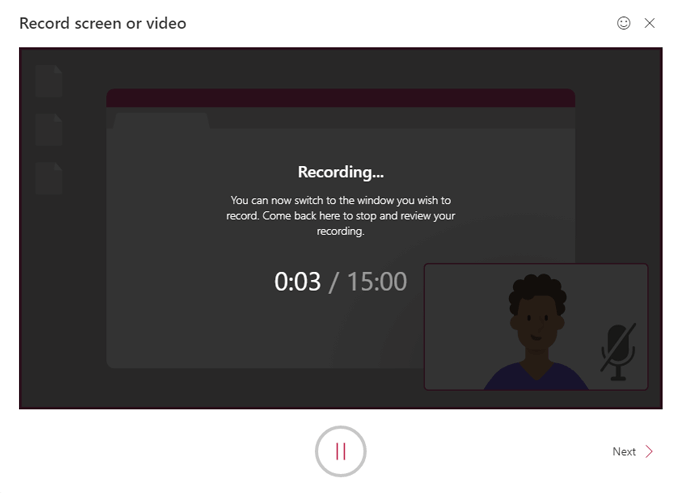 - At any time during recording, you can press the **pause** button. Each time you resume recording, you’ll get the 3-second countdown again. Resume recording by selecting the record button again or end the recording by clicking **Next**.