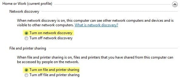 Step 2: The second step is to turn on File and Printer Sharing and to allow it through the Windows firewall. To do this, go to Control Panel and click on Network and Sharing Center first. Click on the Change advanced sharing settings link in the left menu and select the radio button for** Turn on network discovery** and Turn on file and printer sharing.