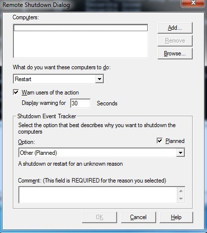 Of course, you need to know the actual computer name, which I mentioned how you can determine above. So add as many computers to the list as you like and then set your options. You can shutdown, restart or annotate unexpected shutdown.