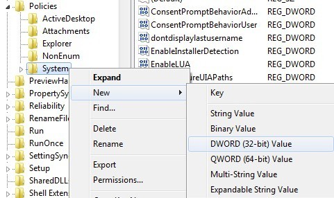 Right-click on System on the left hand side and choose New – DWORD (32-bit) Value.