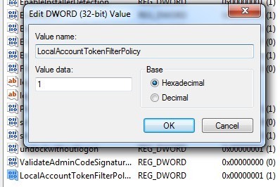 Click OK and close out of the registry. You don’t need to restart the computer as the changes should take effect immediately. This registry key is needed because in Windows Vista and higher, an administrator account is stripped of its credentials when connecting remotely. This will allow the account to remain with administrative privileges.