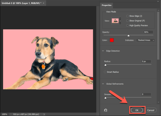 - In the Select and Mask mode, click the Select Subject button. The built-in AI will automatically select the main subject of the image, with a preview shown on the left. Adjust the settings on the right accordingly (although the default settings should work for most users), then click OK in the right-hand menu to confirm.