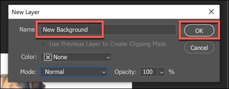 - If you decide to paste an image in your clipboard as a layer, you’ll be asked to name the layer first. Give the layer a name (for instance, New Background) then click OK to confirm.