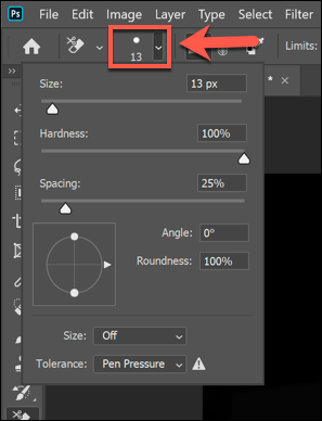 - You’ll need to adjust the sensitivity settings to be able to cleanly cut the background from the image. To do this, make sure that the **Background Eraser **tool is selected, then click the **settings icon **in the menu at the top. This will provide you with a drop-down menu containing options to control the size of the eraser, hardness, and tolerance of the tool.