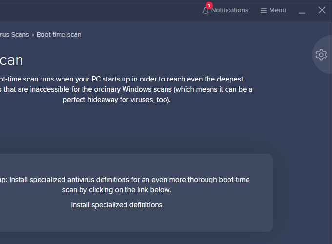 - Select the settings/gear icon at the top right to open Avast’s boot-time scan settings.