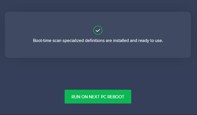 - Select RUN ON NEXT PC REBOOT. Also on this screen is an Install specialized definitions link that you can click to download more definitions that are supposed to help find viruses during the bootup process.