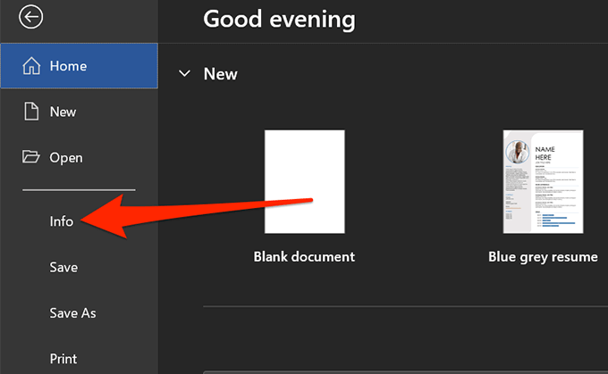 - Select Info from the options available in the left sidebar.