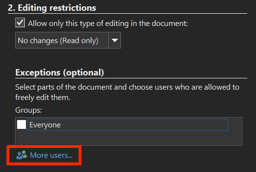 - Word gives you an option where you can allow certain people to edit your document even if it’s been restricted. To use it, select the part of your document that you want to keep editable for your chosen users. * Click on **More users** under **Exceptions (optional)** on the right-hand side pane to select users who’re allowed to make edits to the document.