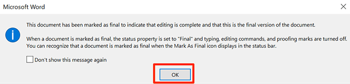 - You’ll see another prompt on your screen describing what marking as final means. Click on **OK** to continue.