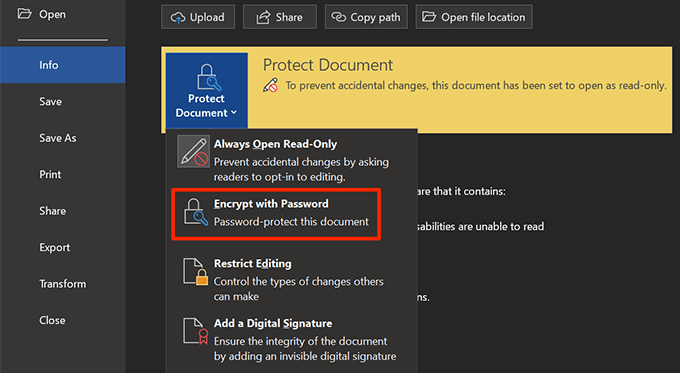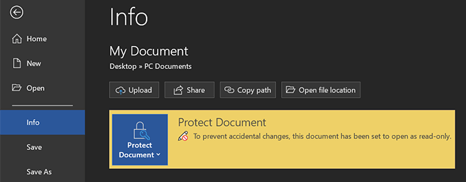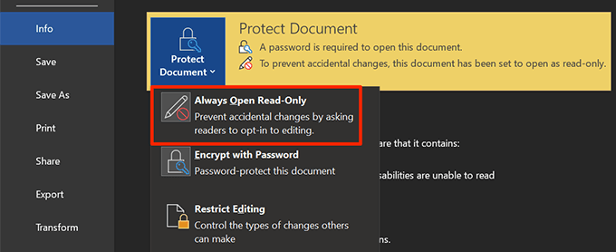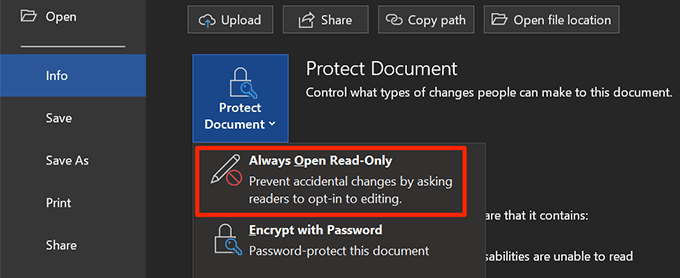 - Your document is now protected with a password and it’ll only open if you enter the correct password. * If you ever need to disable protection, go back to the same **Info** menu, click on **Protect Document**, and choose **Always Open Read-Only**.