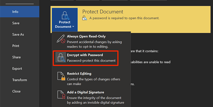 - Click on **Protect Document** again and select **Encrypt with Password**.