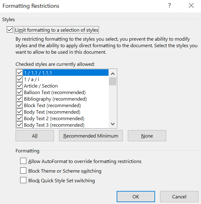- A box will open on your screen. Here, you can specify what formatting styles are to be allowed for your document while restricting the others. Tick-mark the ones you want to keep. You can click on **All** to select all formatting options or **None** to select none of them. Finally, click on **OK** to save the changes.
