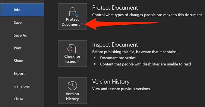 - On the following screen, click on the small down arrow icon under **Protect Document**.