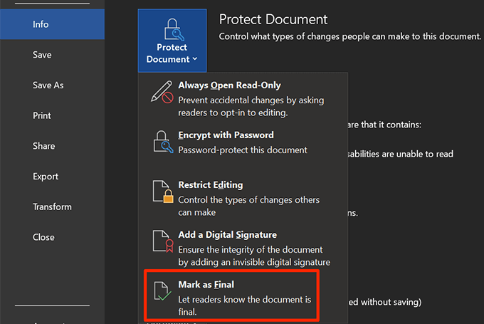 - Click on **Protect Document **on the right-hand side menu and select **Mark as Final**.